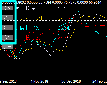 大口投機筋・小口投機筋・機関投資家・レバレッジファンドそれぞれのRSIを、お好みによって表示・非表示と切り替えることができます。