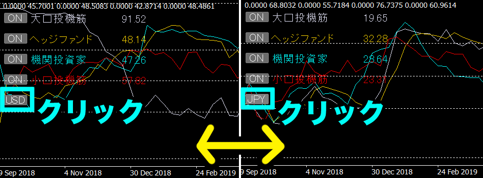 FXの通貨ペアの場合、USD⇔JPYのように通貨ペアに応じたポジション量RSIをワンクリックで切り替えることができます。