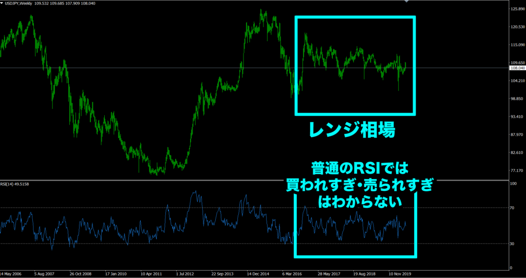 MT4付属の「価格に対するRSI」ではレンジ相場のとき50付近で推移しているので、全体的な「買われすぎ・売られすぎ」はわからないですよね。