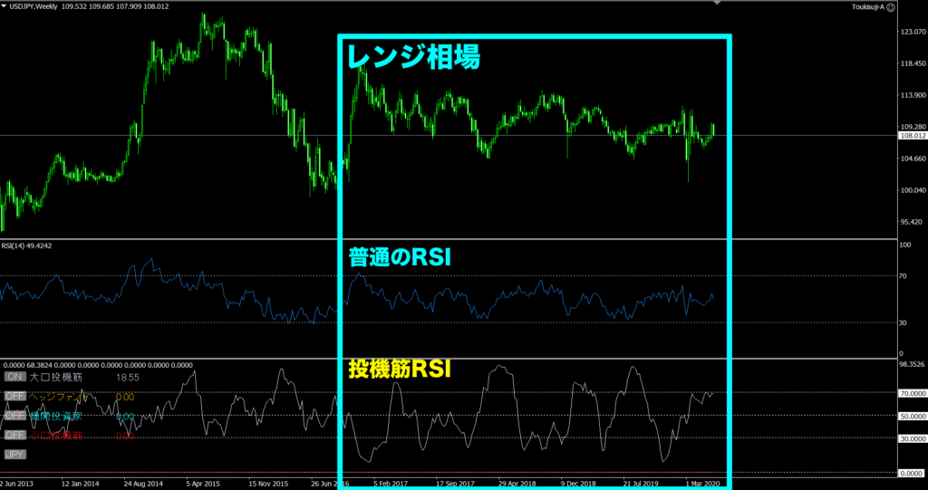これが投機筋RSIだとレンジ相場でも「買われすぎ・売られすぎ」がわかります。