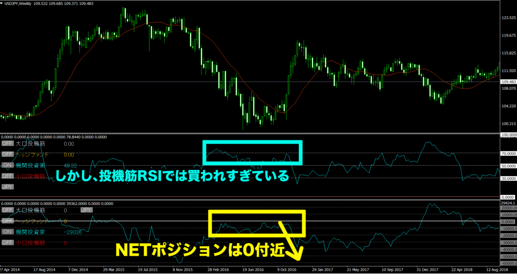 ①投機筋チャートだけではわからない、RSIならではの「買われすぎ・売られすぎ」がわかる。