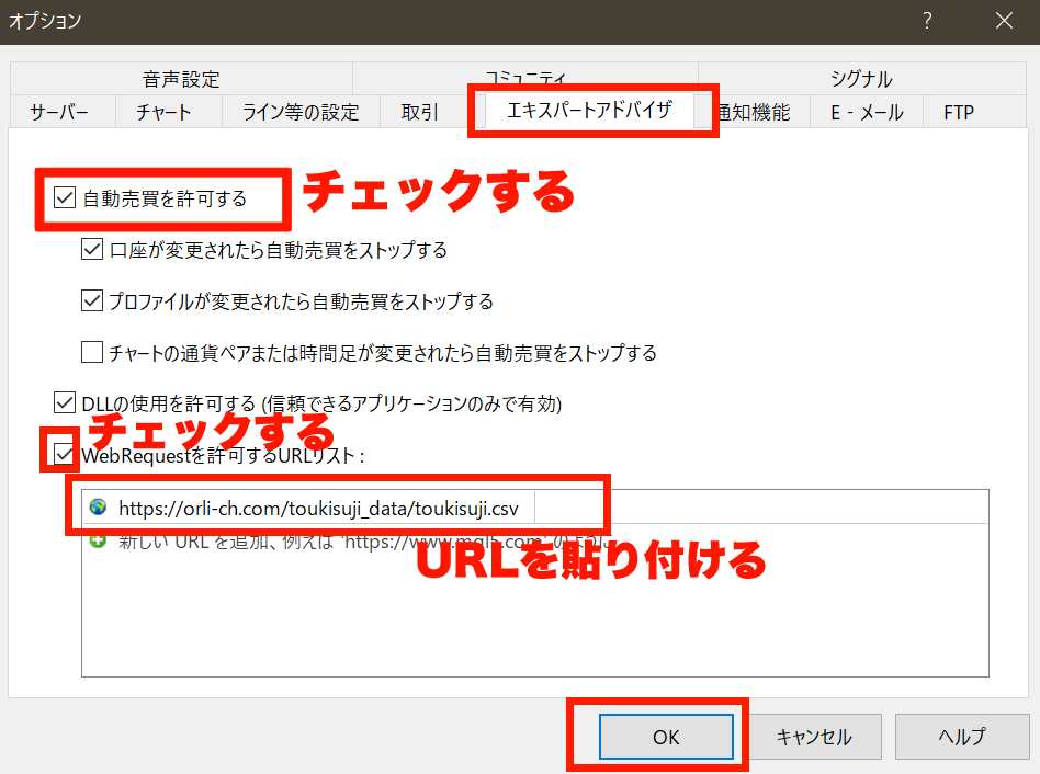 「自動売買を許可する」にチェックを入れますが、手順的に設定するだけであって自動売買の機能はついてないので、ご安心ください。