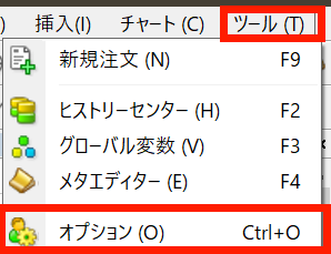 1.上メニューからツール → オプション → エキスパートアドバイザーの順にクリックします。