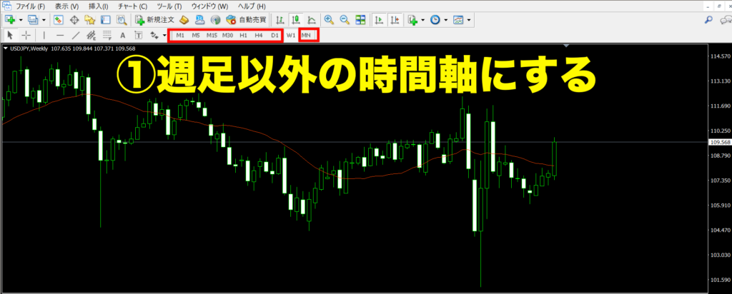 この場合、まず時間足を週足以外に切り替えてみましょう。