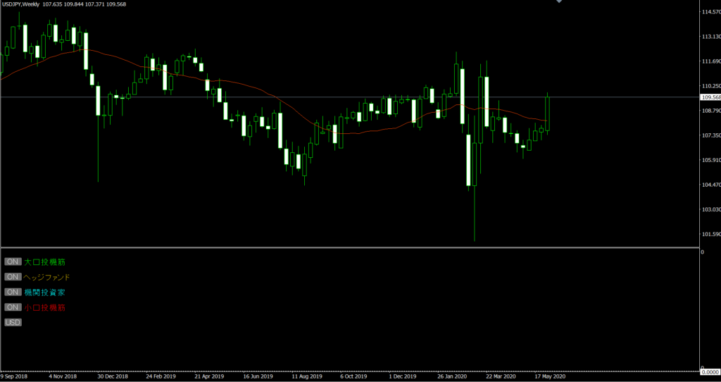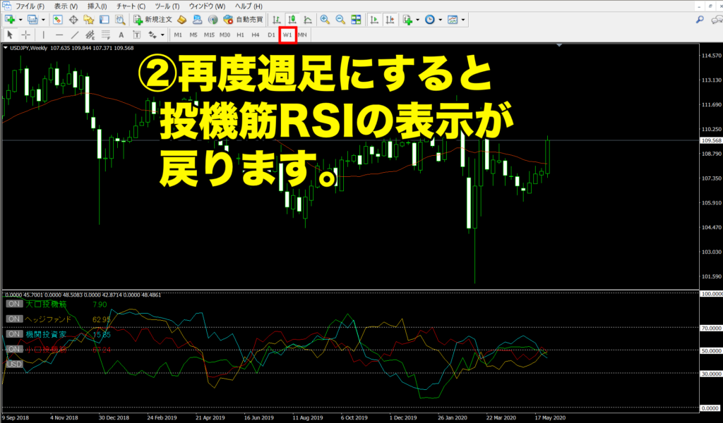 そして再度週足にすると、投機筋RSIが表示されます。