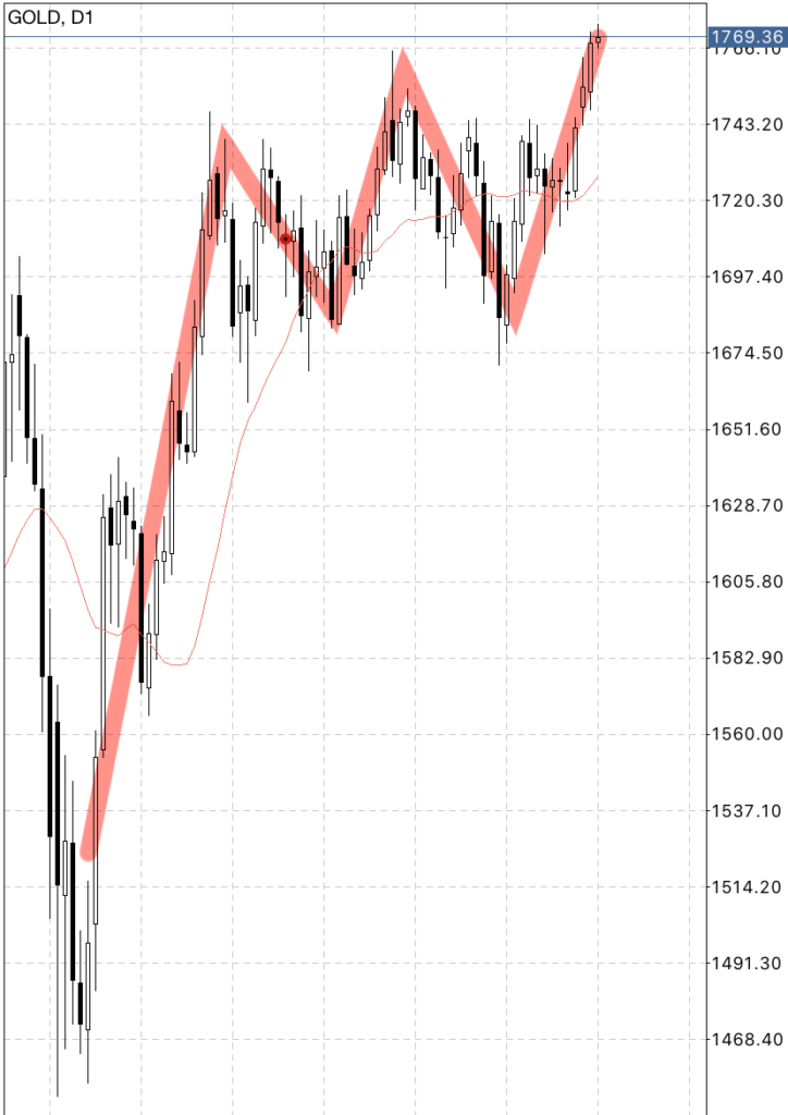 金チャートもヘッドアンドショルダーの形が崩れる可能性が大きくなっており、日足では高値を更新しました。