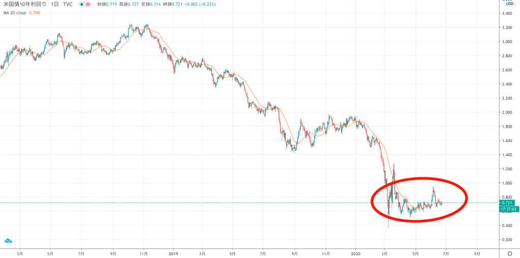 まずアメリカ10年債金利は、最安値付近をずっと横ばいで移動しています。