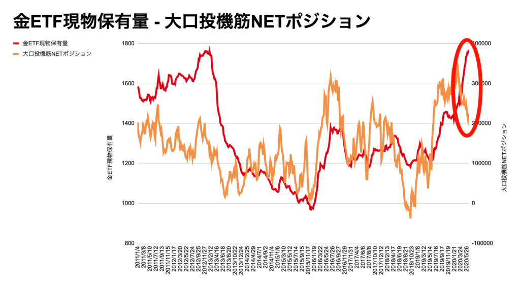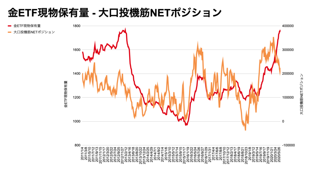 こちらが、金ETFと大口投機筋のNETポジションの比較になります。