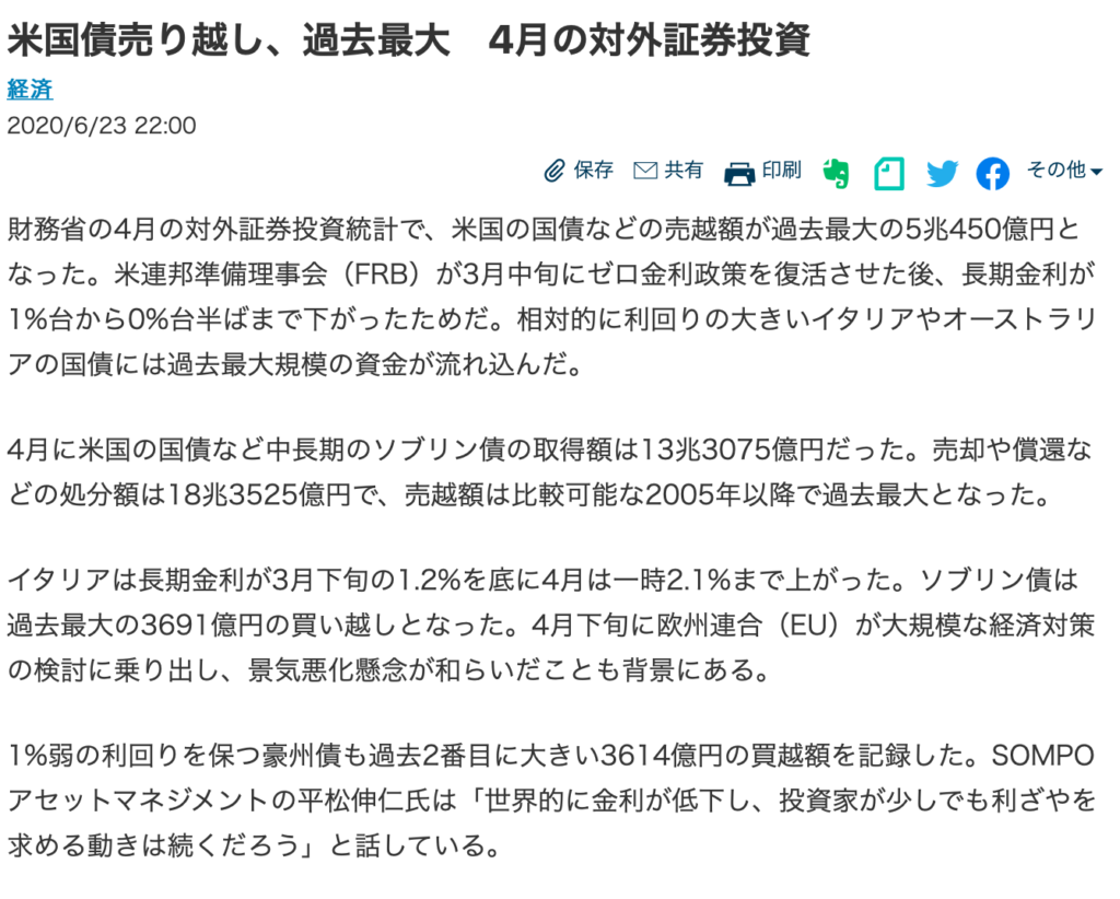 日本経済新聞『米国債売り越し、過去最大 4月の対外証券投資』より引用