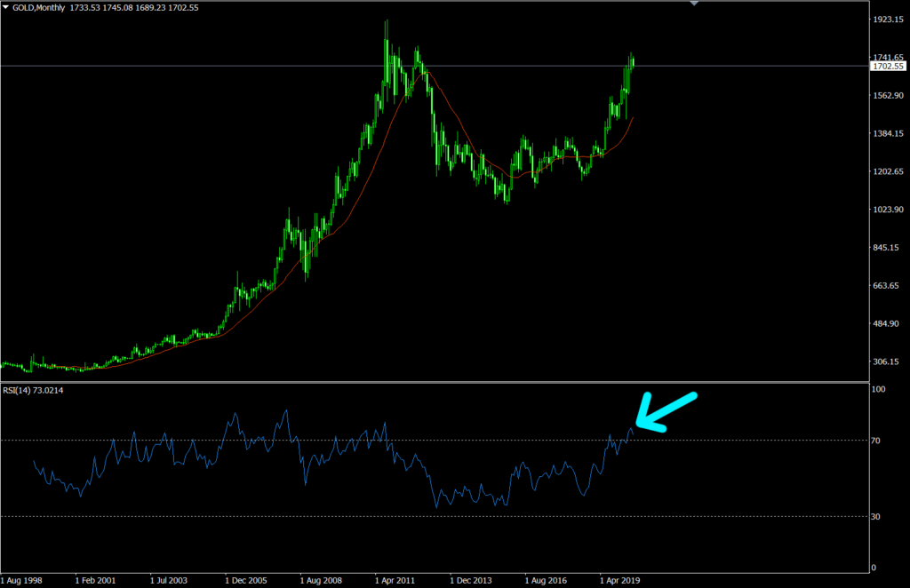 実際に金(ゴールド)の月足でのRSIは70以上で、買われすぎであることがわかります。