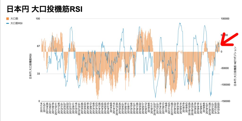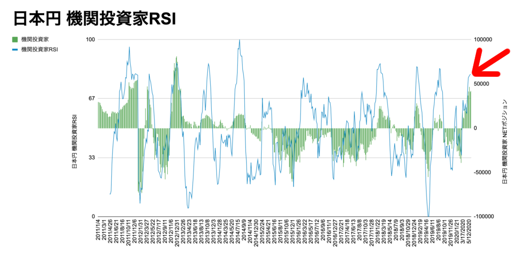 実は円の大口筋・機関投資家のRSIが、現在買われすぎであることがわかります。