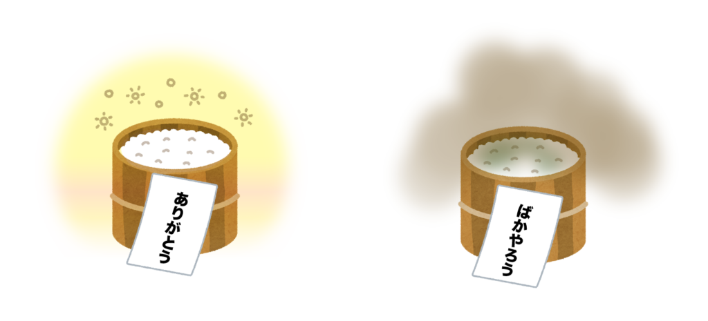 炊いたお米を2つ容器に入れ、それぞれ「ありがとう」「バカやろう」と書いた紙を貼って放置するという実験があります。