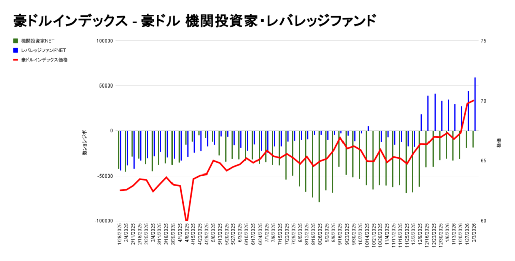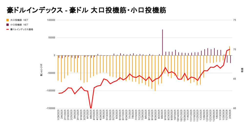 まず、こちらは豪ドルインデックスと豪ドルのポジション量になります。
