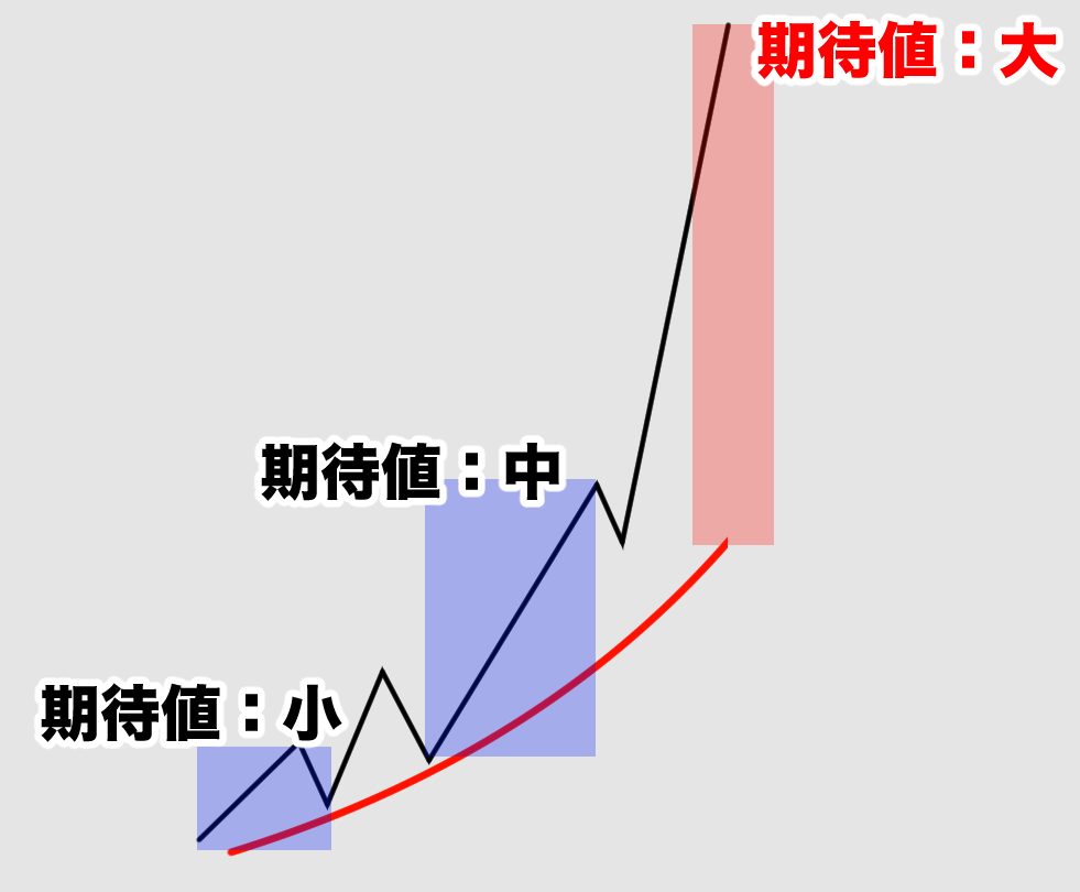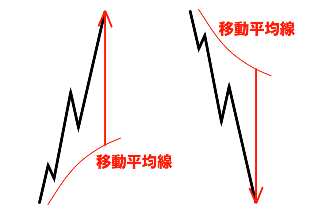 これがトレードでも同じように、移動平均線から大きく離れるほど転換の期待値が増す傾向があります。