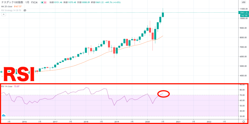 現在、ナスダックも月足でRSIが70を超えているので、買われすぎであることがわかります。