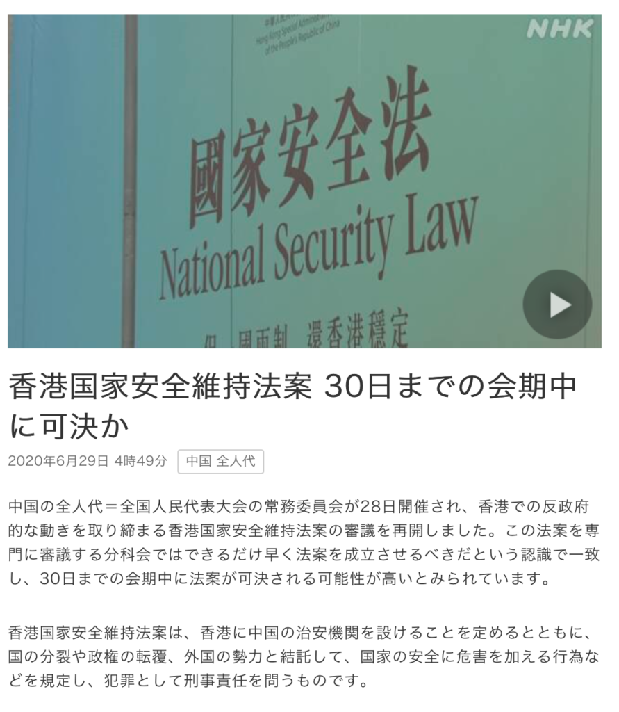 NHK NEWS WEB『香港国家安全維持法案 30日までの会期中に可決か』より引用