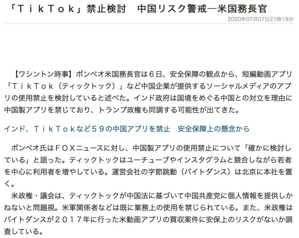 時事ドットコムニュース『「TikTok」禁止検討 中国リスク警戒―米国務長官』より引用
