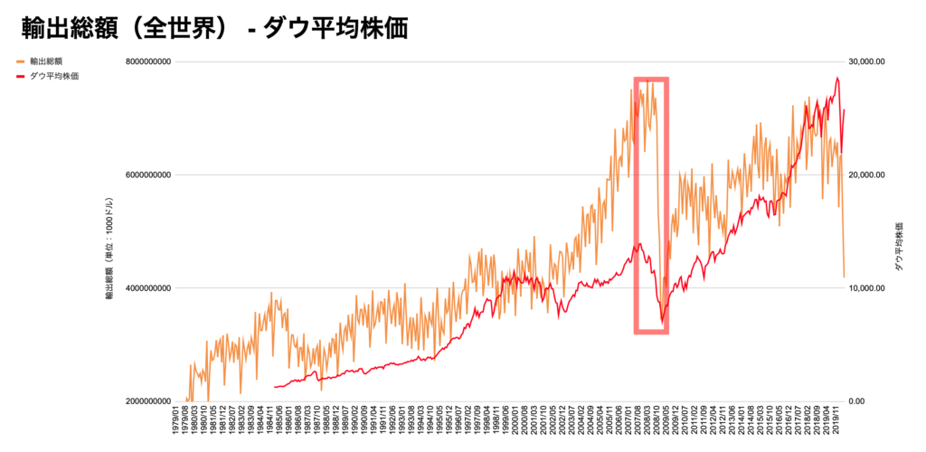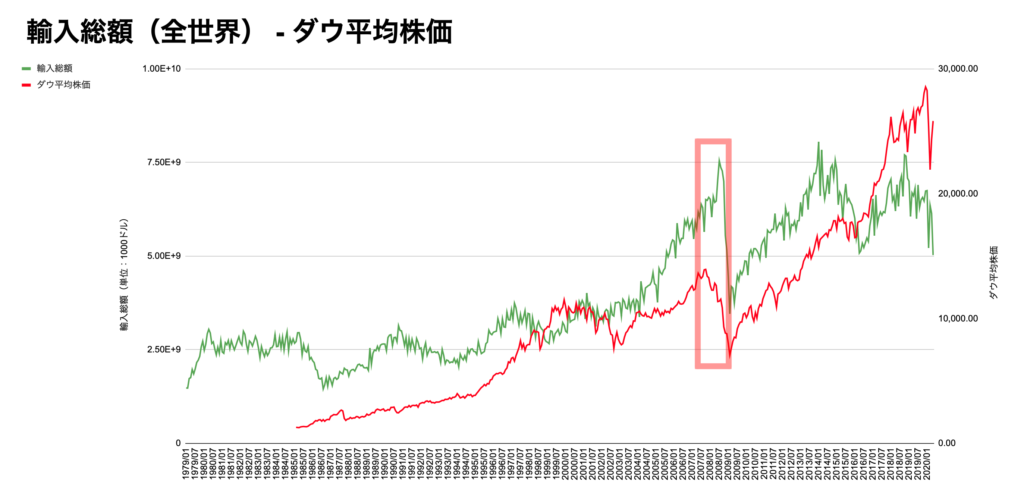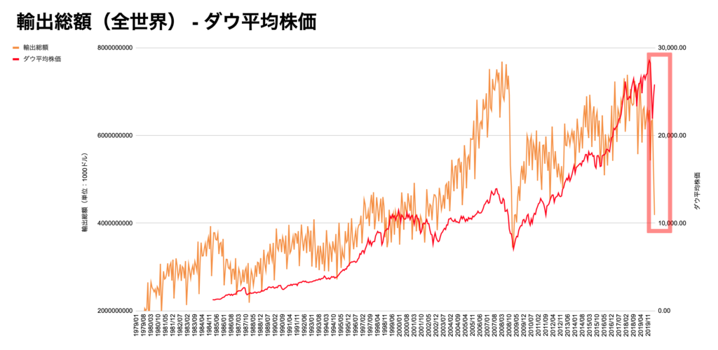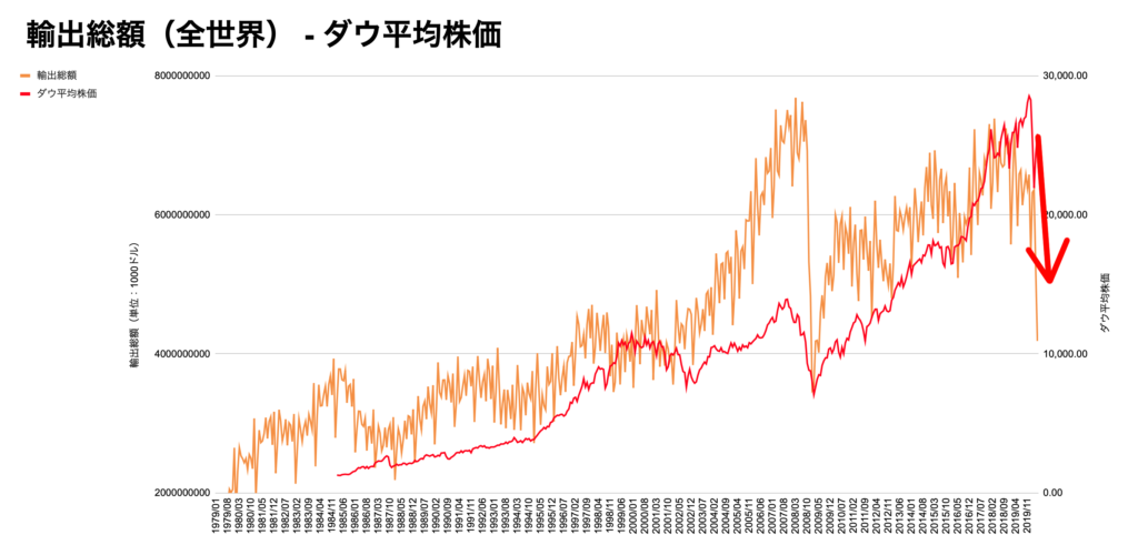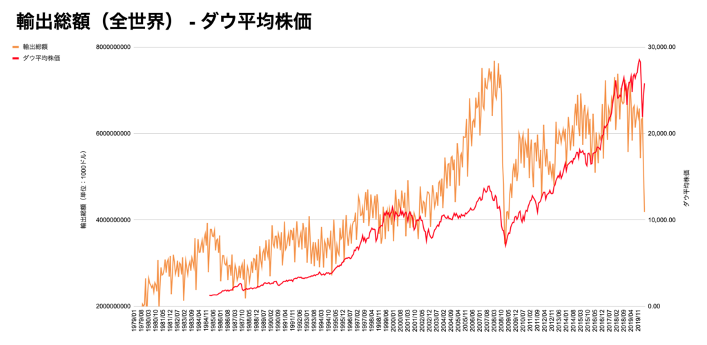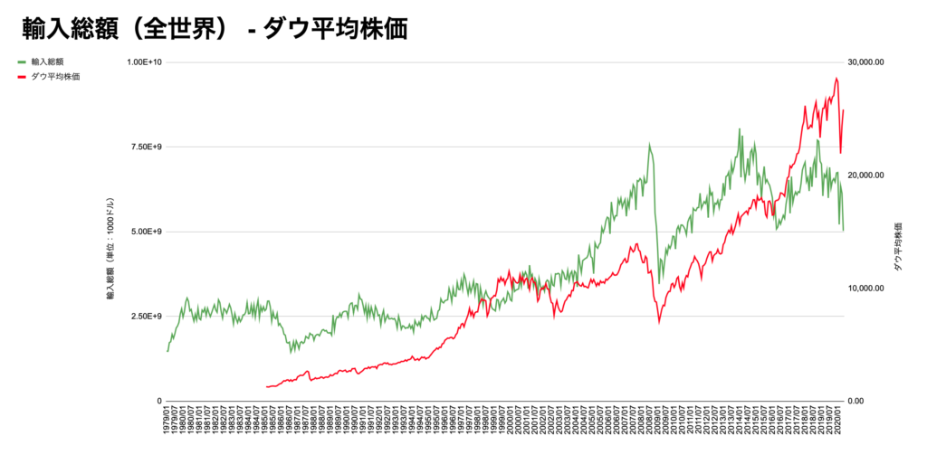 こちらはダウ平均株価全世界の輸出総額・輸入総額のチャートになります。