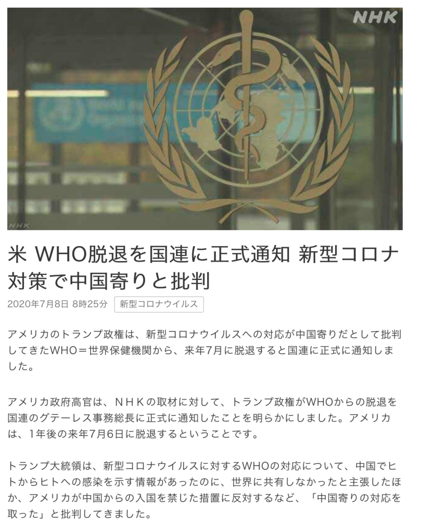 前回のアメリカのWHO脱退表明について、詳しくはこちらの記事をご覧くださいませ。