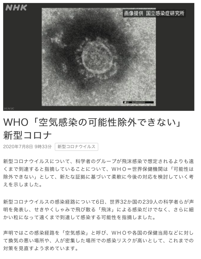 NHK NEWS WEB『WHO「空気感染の可能性除外できない」新型コロナ』より引用