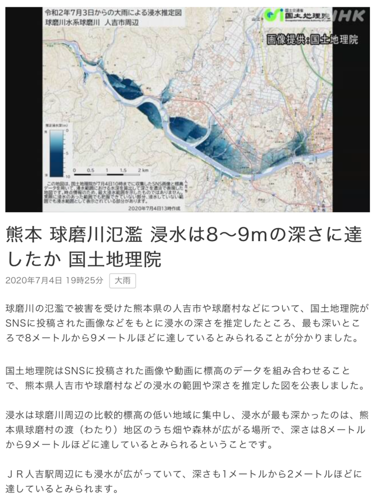 NHK NEWS WEB『熊本 球磨川氾濫 浸水は8~9mの深さに達したか 国土地理院』より引用