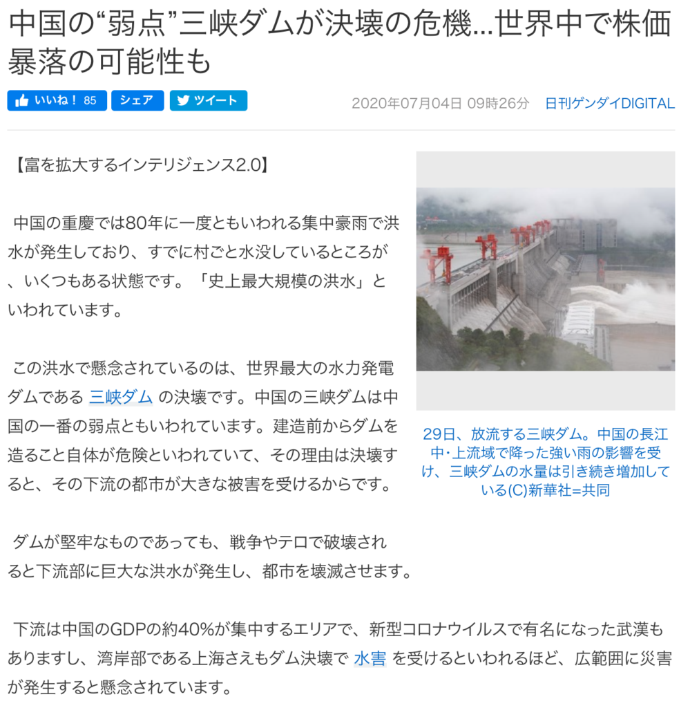 ニフティニュース『中国の“弱点”三峡ダムが決壊の危機…世界中で株価暴落の可能性も』より引用