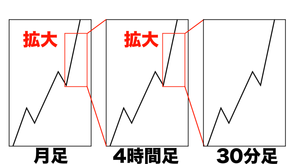 たとえば月足で大きなトレンドがあった場合、拡大していくとその中にもトレンドが存在します。