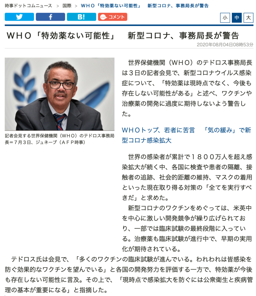 タカシさん、こんにちは!「新型コロナに対する特効薬は現時点で存在せず、今後もない可能性がある」とテドロス事務局長が報じました。