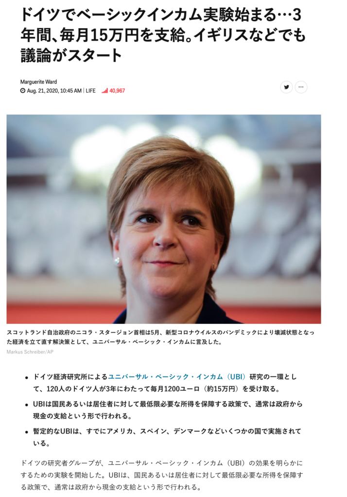 BUSSINES INSIDER『ドイツでベーシックインカム実験始まる…3年間、毎月15万円を支給。イギリスなどでも議論がスタート』より引用