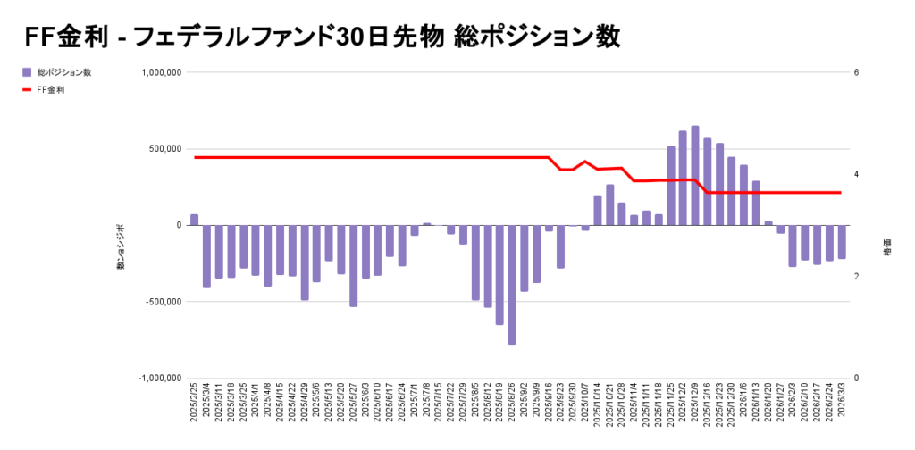 ここでもう一度FF金利のポジション量を見てみると、買いポジション量が大きく解消されつつあることがわかります。