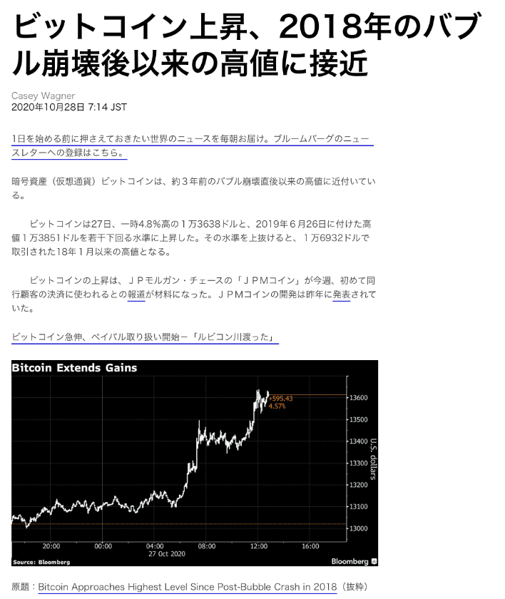 Bloomberg『ビットコイン上昇、2018年のバブル崩壊後以来の高値に接近』より引用