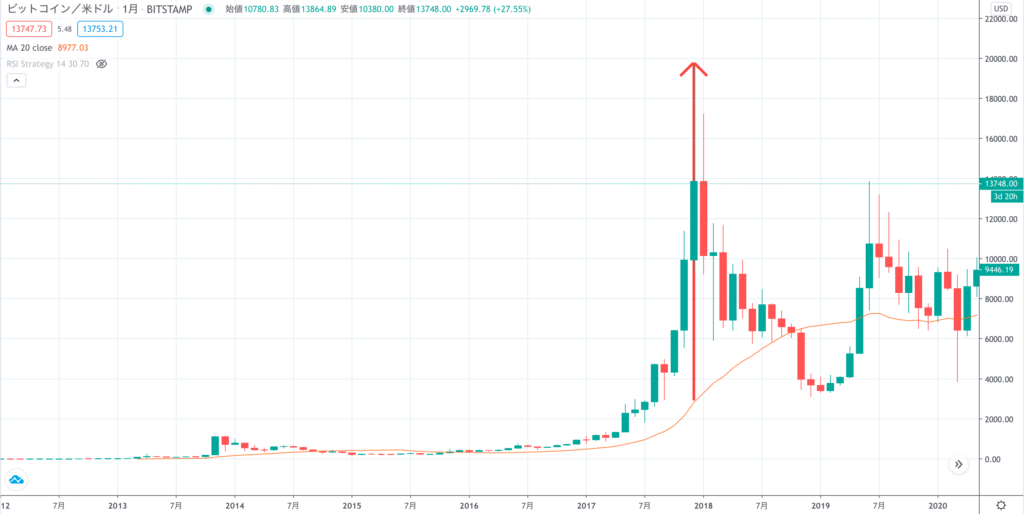 2017年末のビットコインバブルのとき、月足で移動平均線から大きく離れました。
