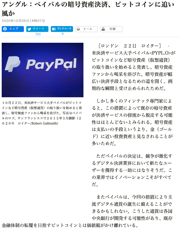 朝日新聞DIGITAL『アングル:ペイパルの暗号資産決済、ビットコインに追い風か』より引用