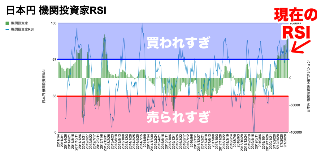 そしてこちらが円の機関投資家の投機筋RSIですが、買われすぎのラインに届いています。