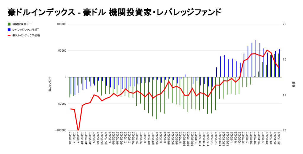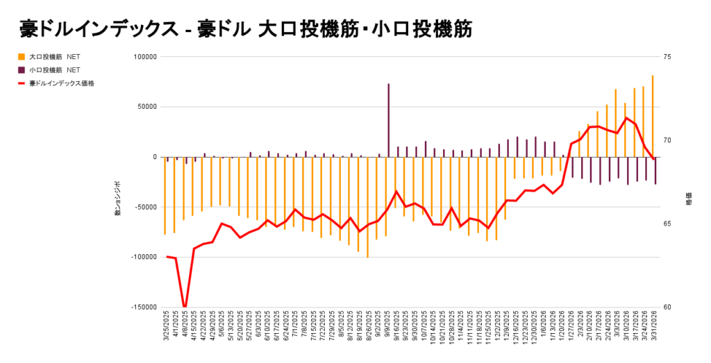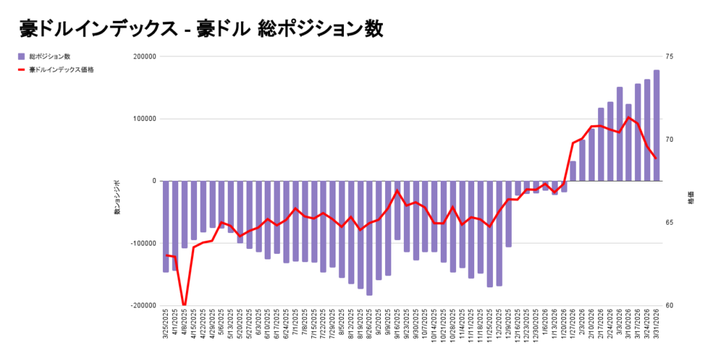 豪ドルはリスクオン(※)で買われてリスクオフ(※)で売られる傾向にあり、これは投機筋チャートでも買いポジション量が増えていることからわかります。