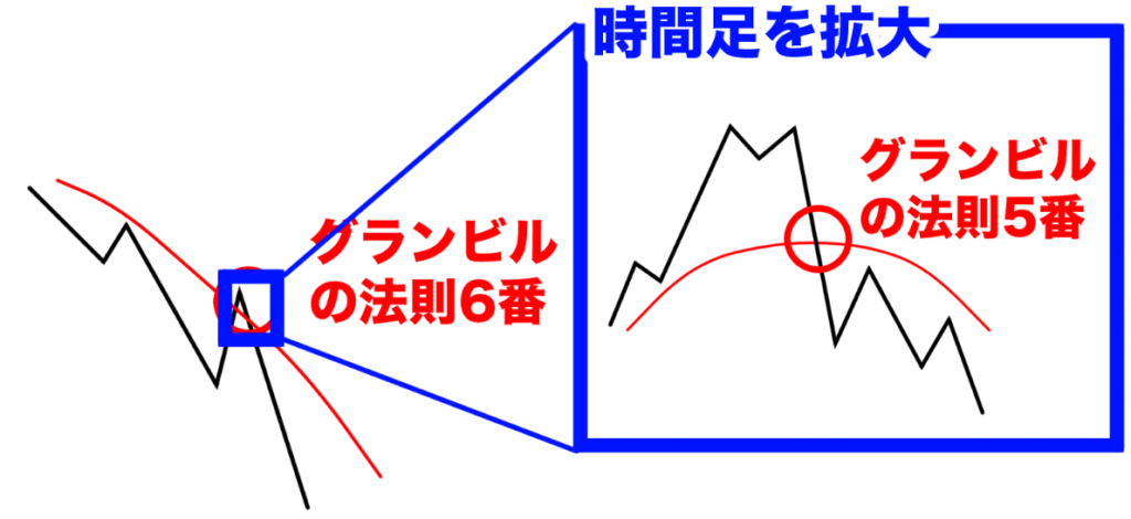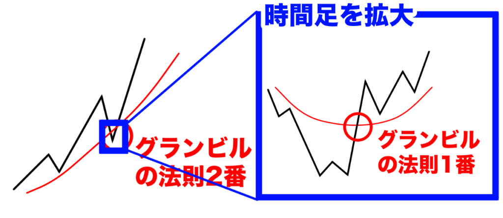 つまり、押し目買いでグランビルの法則2番を使うけど、細かいエントリーポイントを見定めるなら時間足を拡大して、グランビルの法則1番ってことですよね?