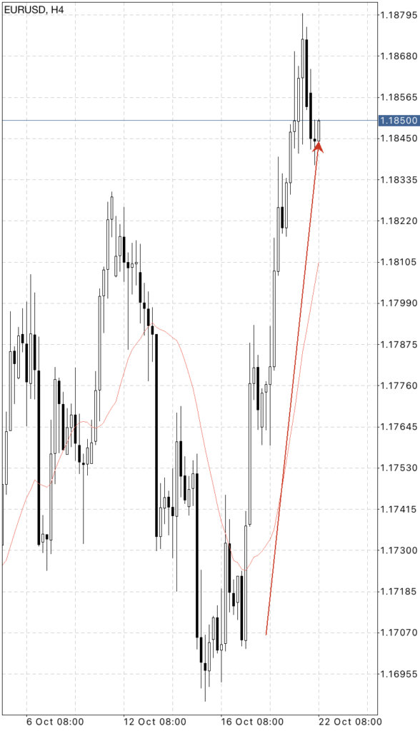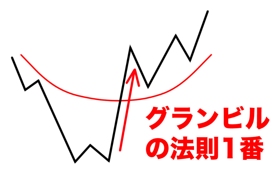 グランビルの法則1番は移動平均線が緩やかに下降から上昇に転じるところで、チャートが下から上に急速に突き抜けるところがポイントです。