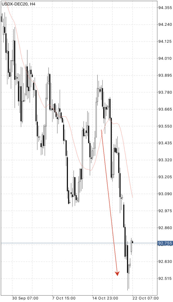 今回ドルインデックスの下落に伴ってドル売りになり、ユーロドルが上昇しました。(※)