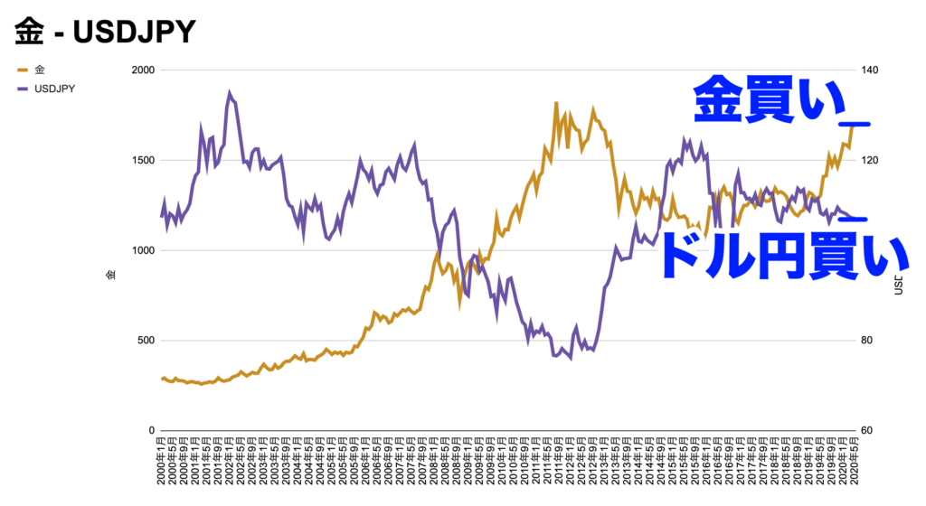 そこですくみとして、金を買ってドル円を買うといった作戦が考えられます。