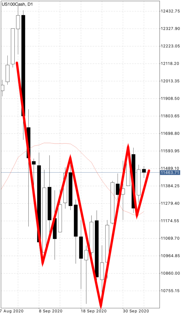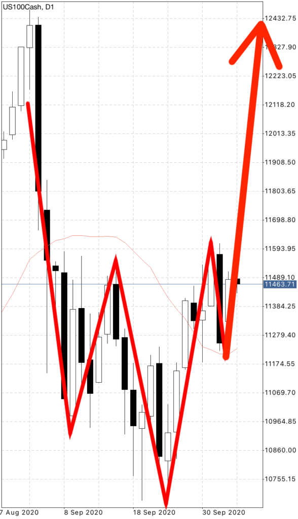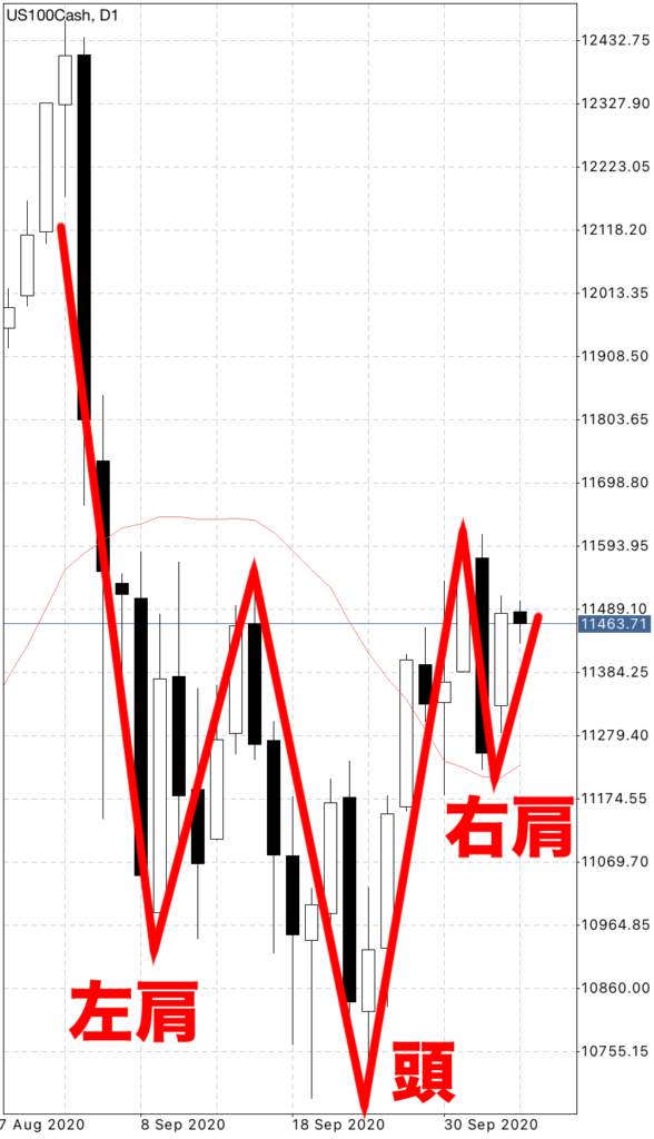 そうですね。現在ナスダックは日足で逆ヘッドアンドショルダーの右肩を形成している可能性があります。