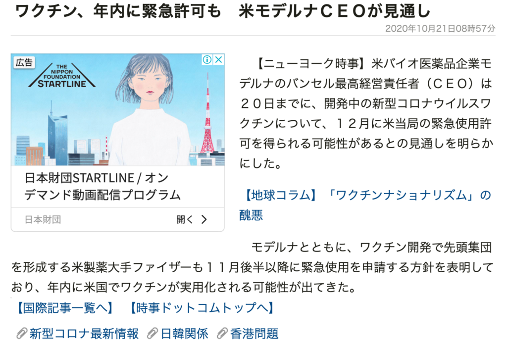 時事ドットコムニュース『ワクチン、年内に緊急許可も 米モデルナCEOが見通し』より引用