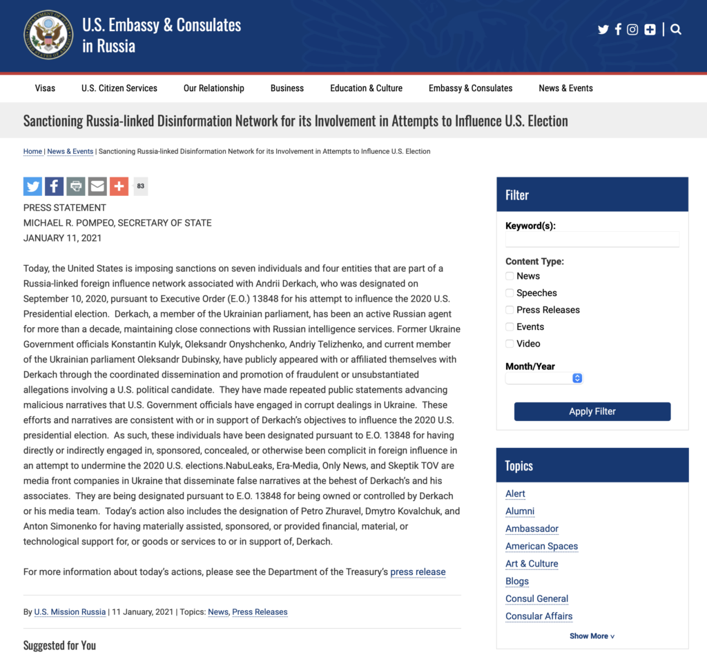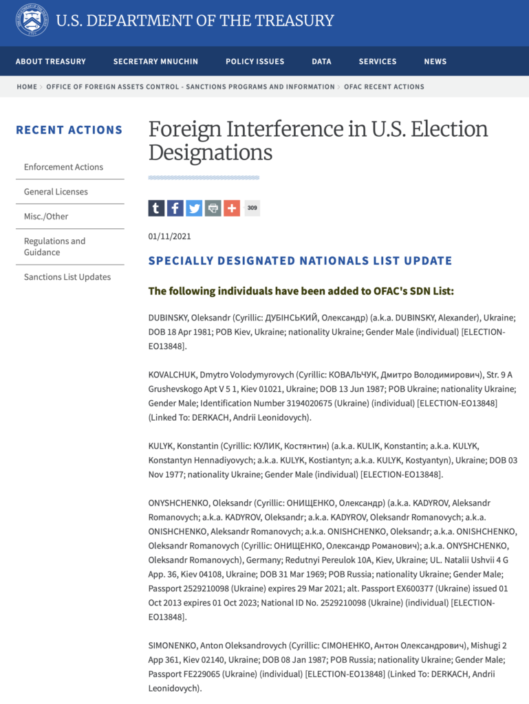 今日、米国は、大統領令(EO)13848に従って、2020年9月10日に指名されたアンドレイデルカッチに関連するロシアにリンクされた外国の影響ネットワークの一部である7人の個人と4つのエンティティに制裁を課しています。 2020年の米国大統領選挙に影響を与えるため。ウクライナ議会のメンバーであるデルカッチは、10年以上にわたって活発なロシアのエージェントであり、ロシアの諜報機関との緊密な関係を維持しています。元ウクライナ政府高官のコンスタンティン・クリク、オレクサンドル・オニシェンコ、アンドレイ・テリシェンコ、そして現在のウクライナ議会のメンバーであるオレクサンドル・ドゥビンスキーは、米国の政治候補者を巻き込んだ詐欺的または根拠のない主張の調整された普及と促進を通じて、デルカッチに公に現れた。彼らは、米国政府当局者がウクライナで腐敗した取引に従事しているという悪意のある物語を進める公の声明を繰り返し行っています。これらの努力と物語は、2020年の米国大統領選挙に影響を与えるというデルカッチの目的と一致しているか、それを支持しています。そのため、これらの個人は、2020年の米国選挙を弱体化させるために、直接的または間接的に外国の影響力に関与、後援、隠蔽、またはその他の方法で加担したとして、EO 13848に従って指定されています。NabuLeaks、Era-Media、Only News、とSkeptikTOVは、デルカッチとその仲間の要請で虚偽の物語を広めるウクライナのメディアフロント企業です。それらは、デルカッチまたは彼のメディアチームによって所有または管理されているとして、EO13848に従って指定されています。今日の行動には、デルカッチに対する財政的、物質的、または技術的支援、あるいは商品またはサービスを実質的に支援、後援、または提供したことに対するペトロジュラベル、ドミトロコワルチュク、およびアントンシモネンコの指定も含まれます。