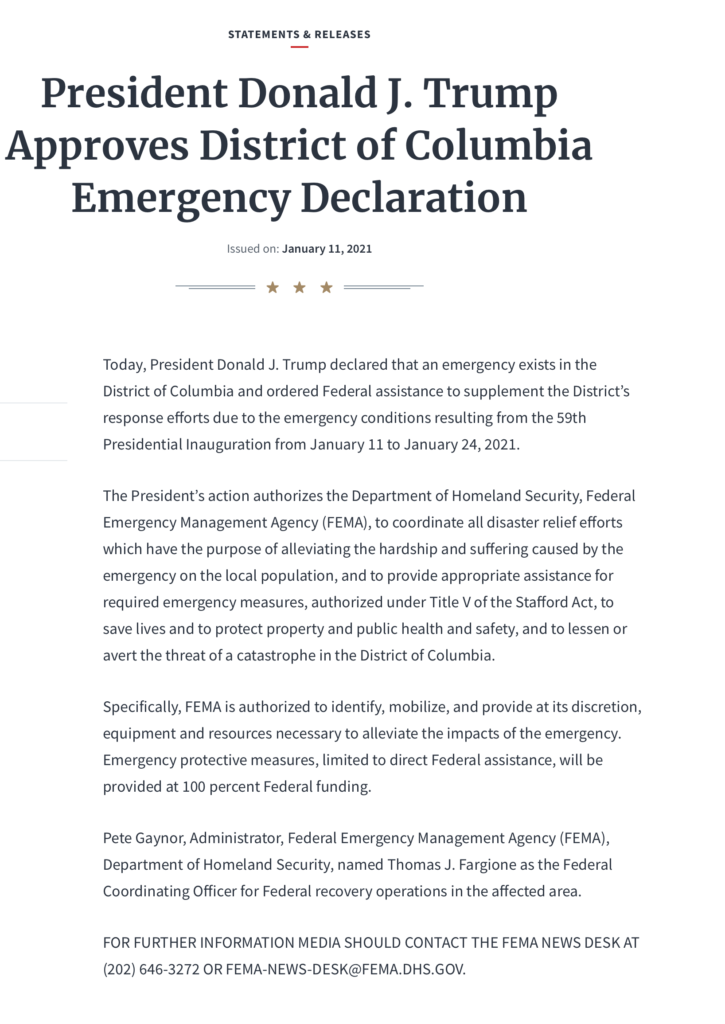 本日、ドナルドJ.トランプ大統領は、コロンビア特別区に緊急事態が存在することを宣言し、2021年1月11日から1月24日までの第59回大統領就任式に起因する緊急事態のため、連邦政府の支援を要請しました。