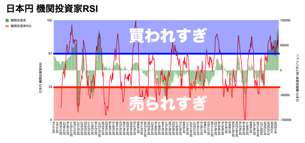 さらに円の機関投資家RSIも買われすぎからの下落の動きが見えています。
