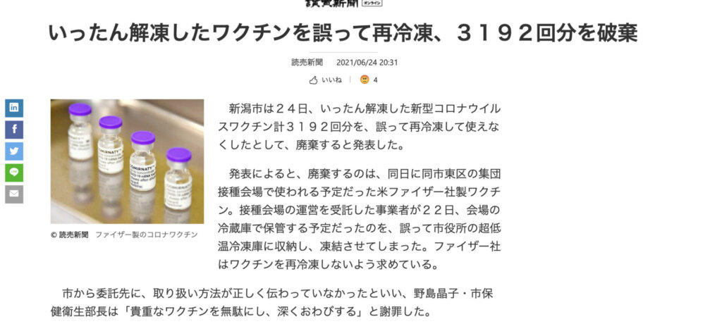今年2月の国会で田村憲久厚労相は「ワクチン接種で死亡した場合は遺族に4420万円支払う」と明言したのに、6月18日までにワクチン接種直後に副反応などで死亡した355人の国民全員について、政府は「ワクチン接種との因果関係が分からない」として1円も払わないという。これじゃ全員泣き寝入りだね。