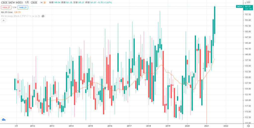 あとネガティブサプライズが起きる確率を示すスキュー指数も最高値を更新したのもあります。