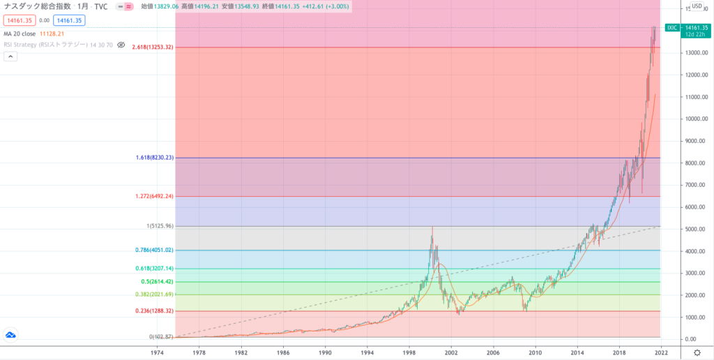 他にもナスダック総合指数はちょっと超えてはいますが、下図のように月足のフィボナッチ261.8%付近にあります。