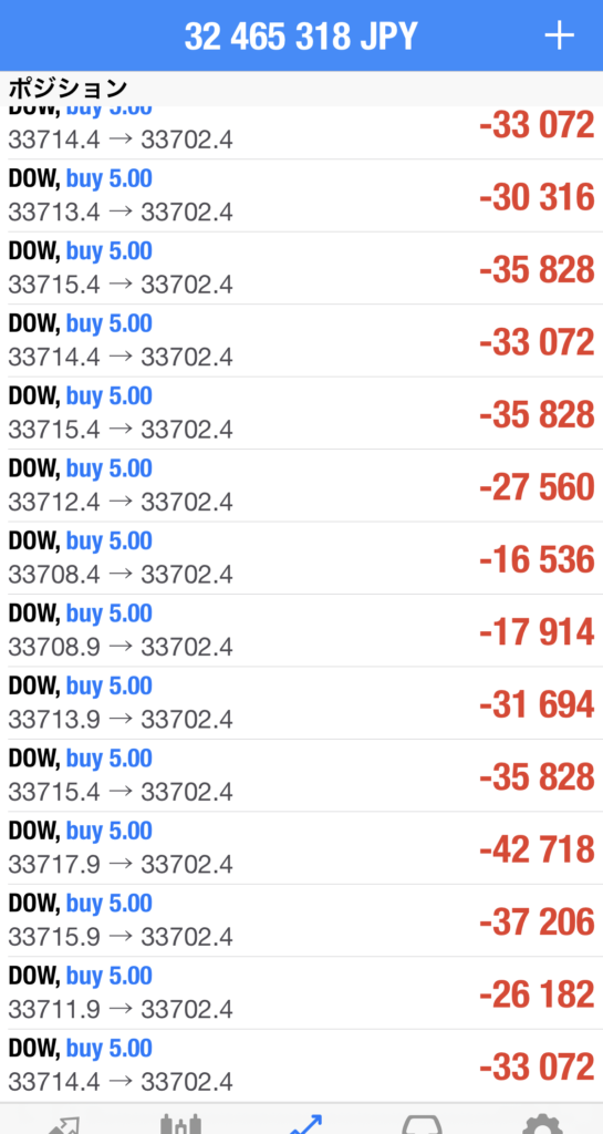 実はNYダウで買いエントリーに入り、両建ての進化系「すくみ」を使ってナスダックのポジションはそのままにしています。