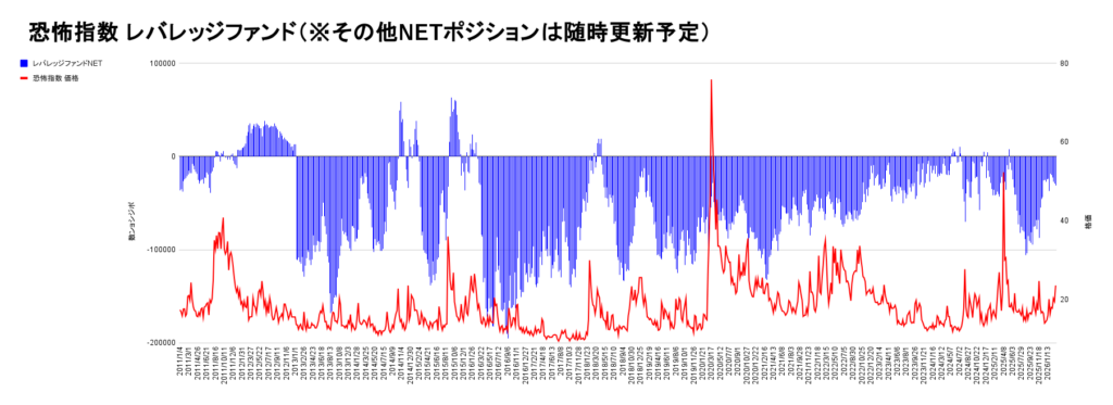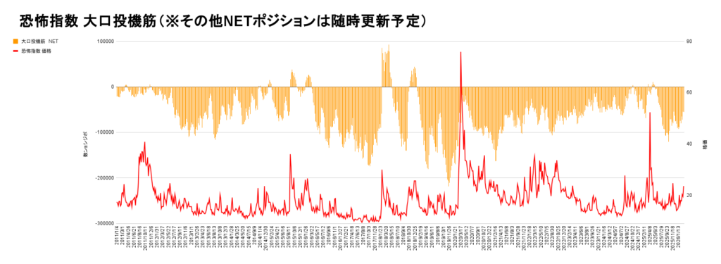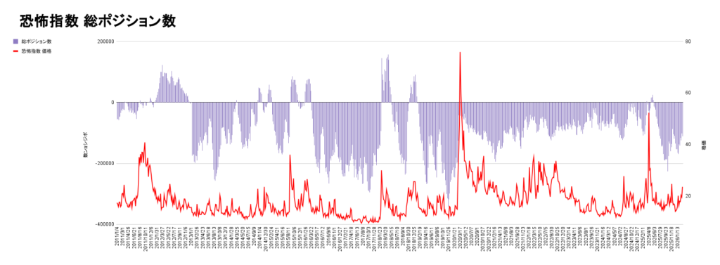 恐怖指数の売りポジション量が解消するということは、恐怖指数は買われ上昇することが考えられます。