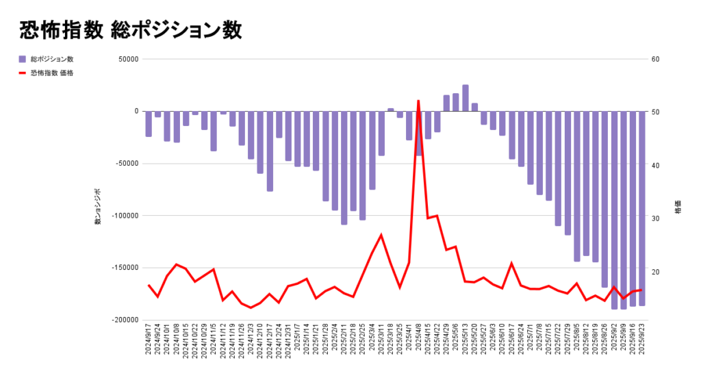 なので恐怖指数の売りポジション量が解消されていっていることは、恐怖指数が上昇して株価暴落へつながる傾向があります。